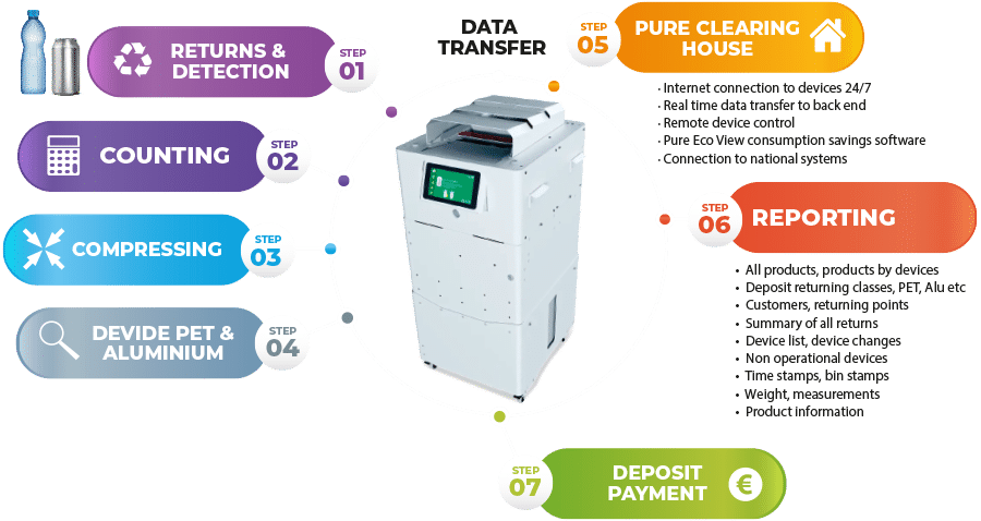 The leading idea of the Pure Crusher compact mini RVM device, is to cost efficiently and effectively compress any amounts of recyclable PET bottles and cans, giving you savings in both costs and capacity throughout the whole reverse logistics chain.